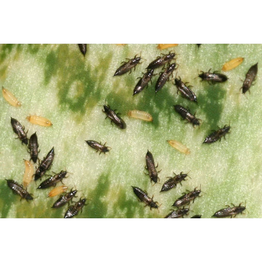 De trips kan vliegen, waardoor hij zich razendsnel kan verplaatsen en ook de plaag zich snel verspreid. De trips is een klein dun insect, met een breedte van bijna 1 mm. De vleugels zijnĀ bijna transparant.Ā Deze kleine insecten (minder dan 1 mm breed) voeden zich door in de cel van het blad te prikken om vervolgens de inhoud op te zuigen.Ā Je zult dit zien doordat bladeren zilverachtige vlekken tonen met daarop kleine donkergroene vlekjes. Wanneer bladeren extreem zijn aangetast, zullen ze bladeren zelfs verdrogen. De volwassen trips verpopt zich in de bodem onder de plant en zal zich daarna weer verplaatsen naar de plant. Vervolgens legt de trips zijn eitjes weer in de plant, waardoor er nieuwe larven ontstaan. De larven van de trips zijn uitstekend te bestrijden met aaltjes.
